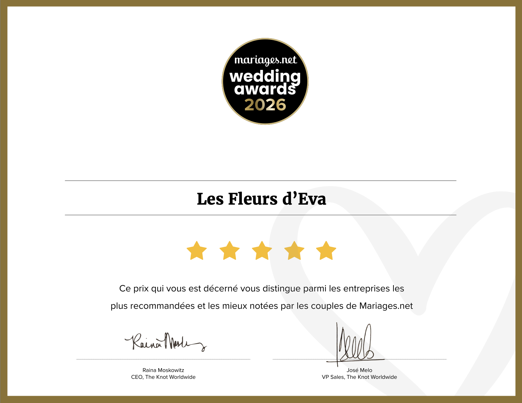 Les Fleurs d'Eva font partie des meilleurs professionnels du mariage en 2024 et 2025. C'est un label qui démontre l'excellence de notre travail.
